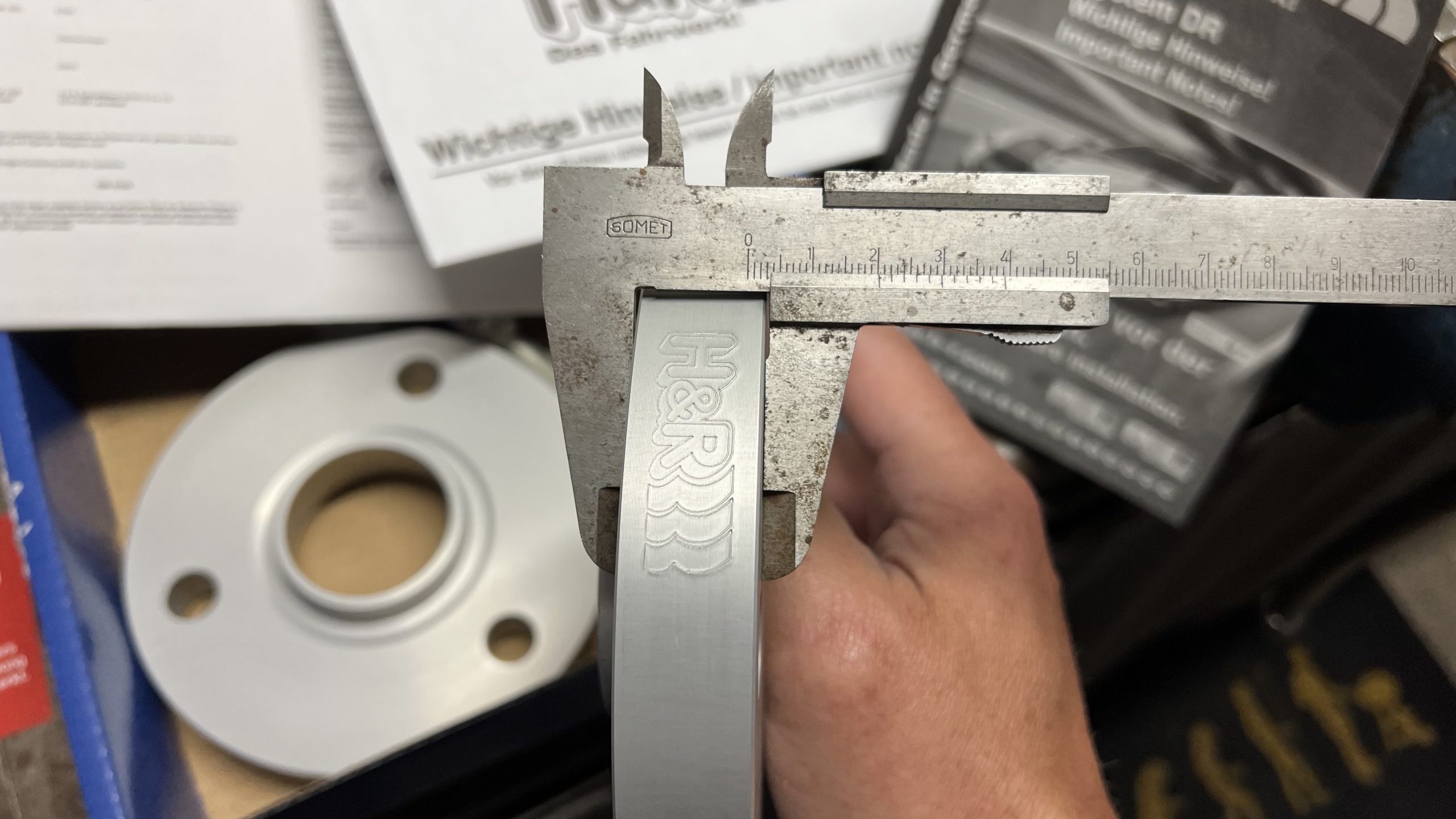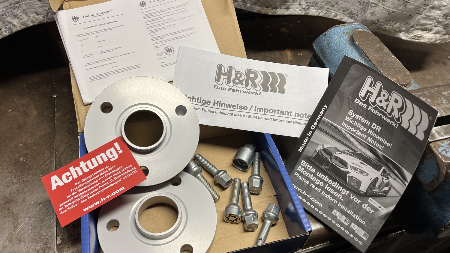 Nach einiger Suche im Internet fand ich bei kfzteile24.de einen Satz Spurverbreiterungen, 40 mm mit ABE (die war mir wichtig). … also bestellt und aufgeregt abgewartet … 😉