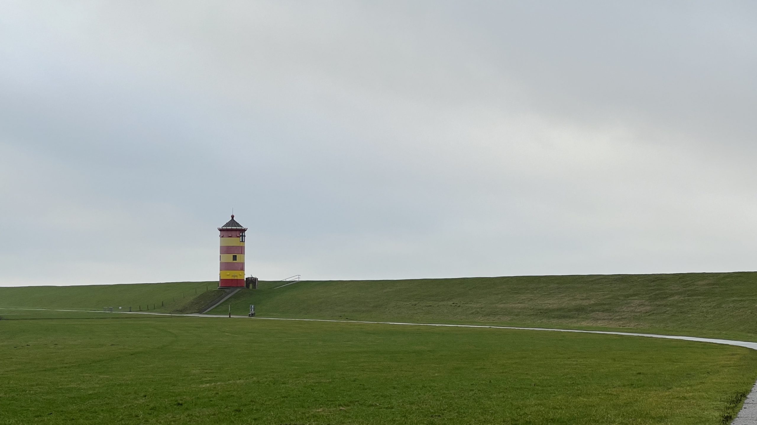 Wir radeln zum Leuchtturm. Ein leichter Nieselregen begleitet uns, während wir am Deich entlang fahren.