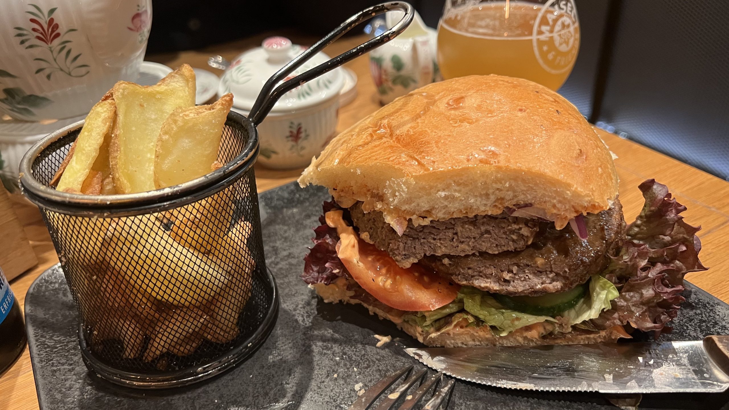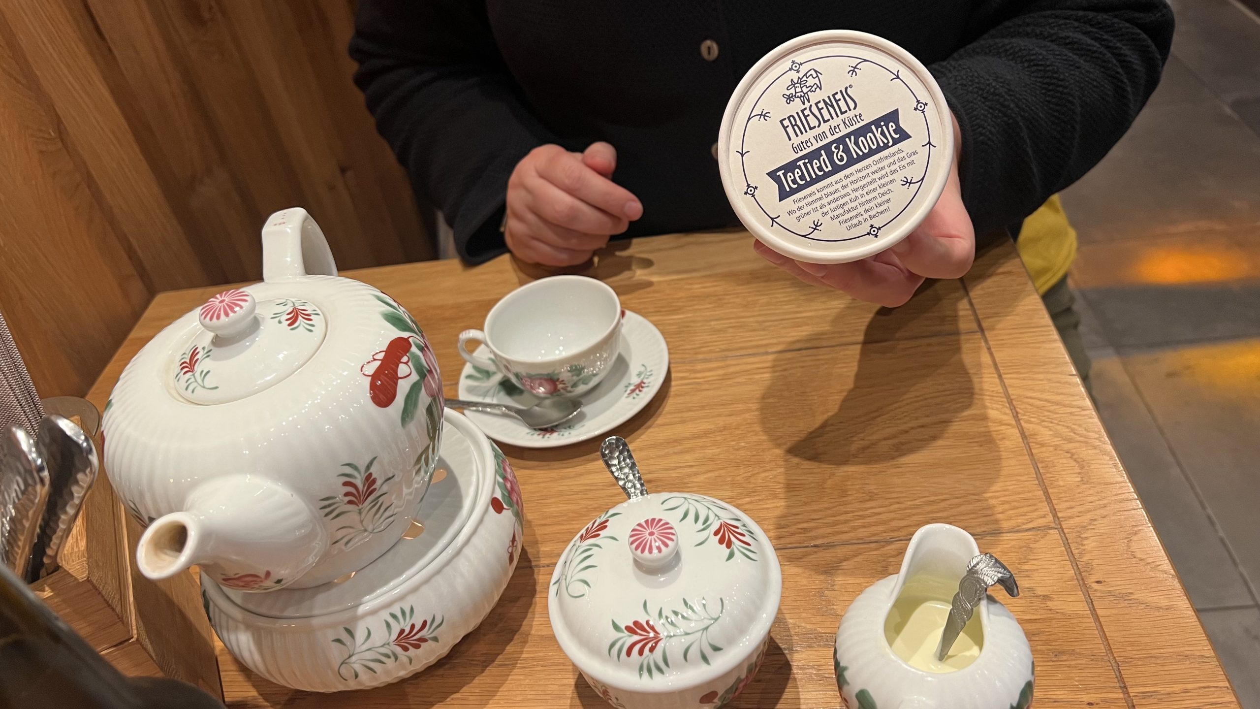 Kerstin nimmt einen Ostfriesen-Tee mit einem Friesen-Eis, ich entscheide mich für den Gezeiten-Burger, der frisch zubereitet wird und so richtig lecker ist.