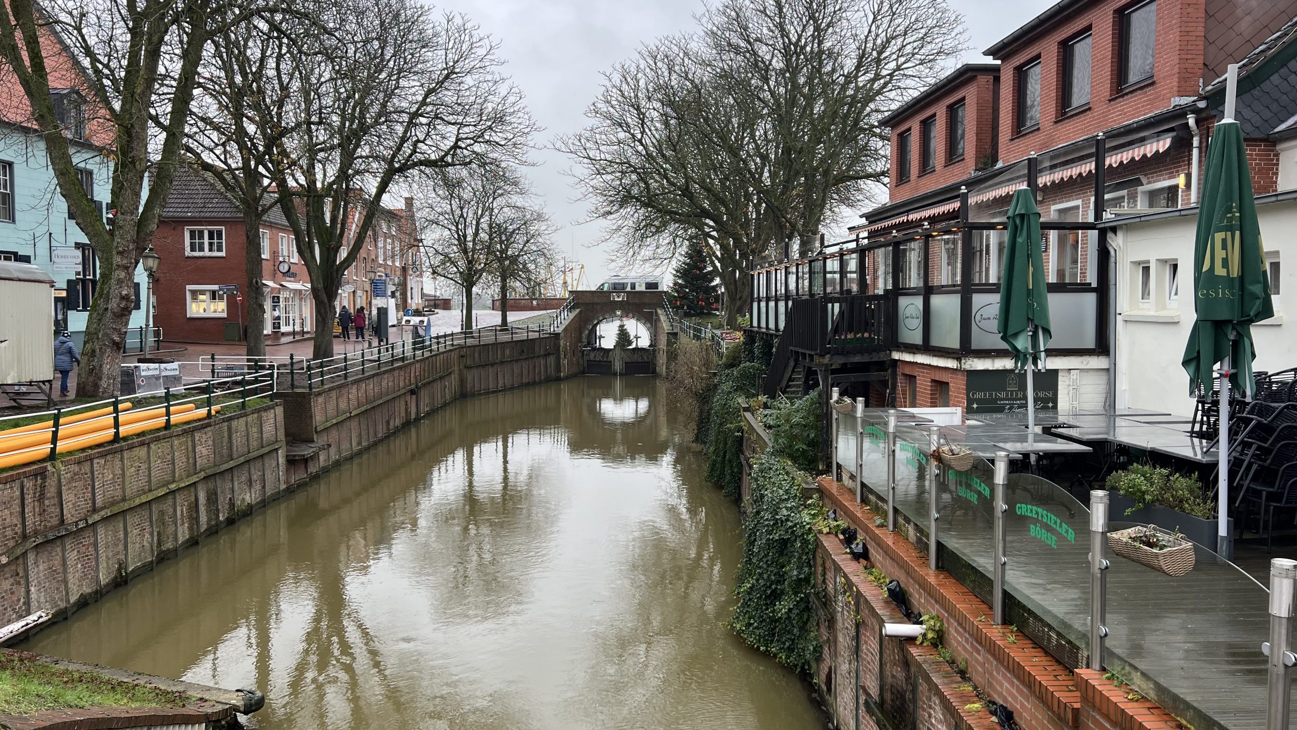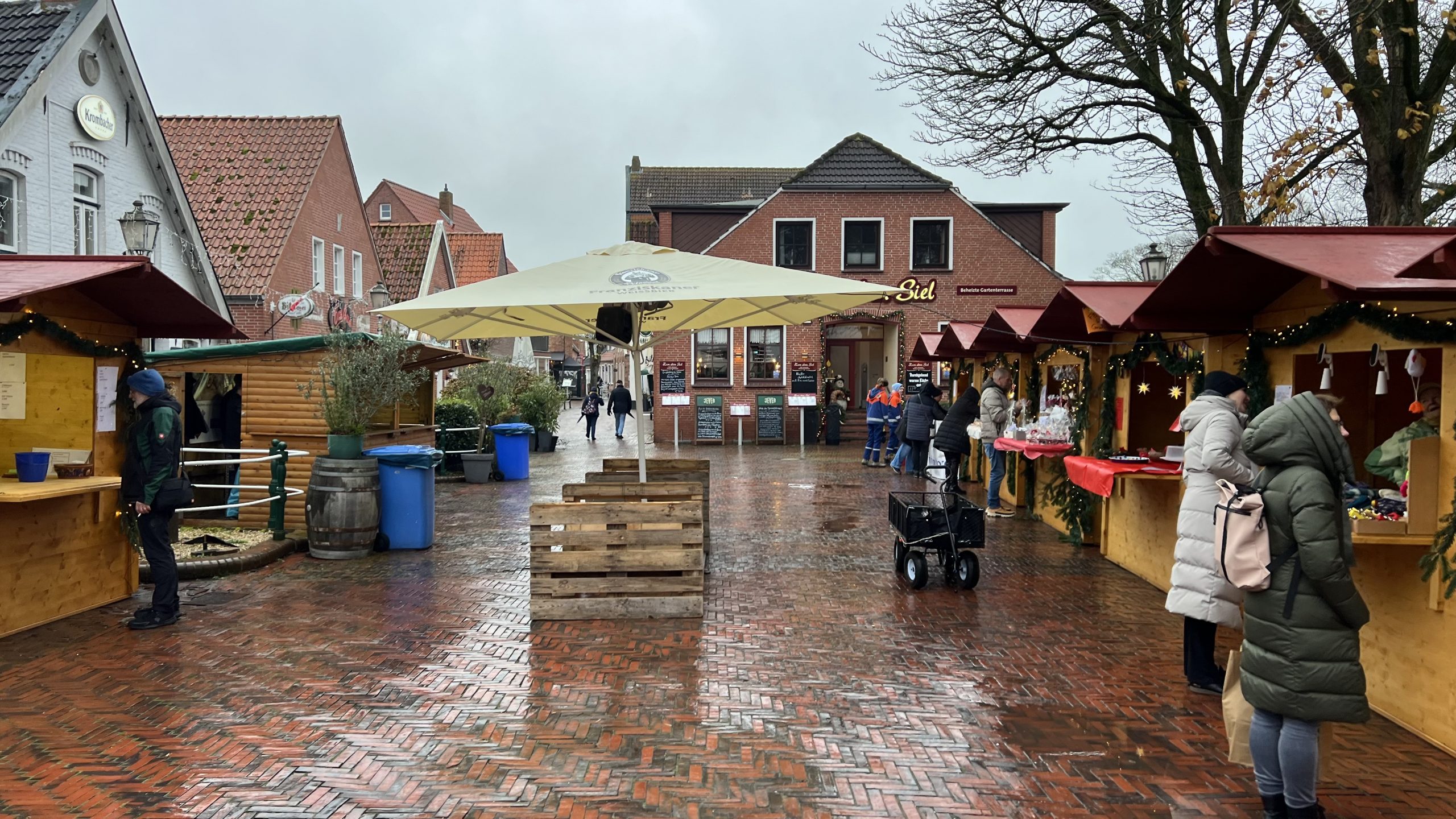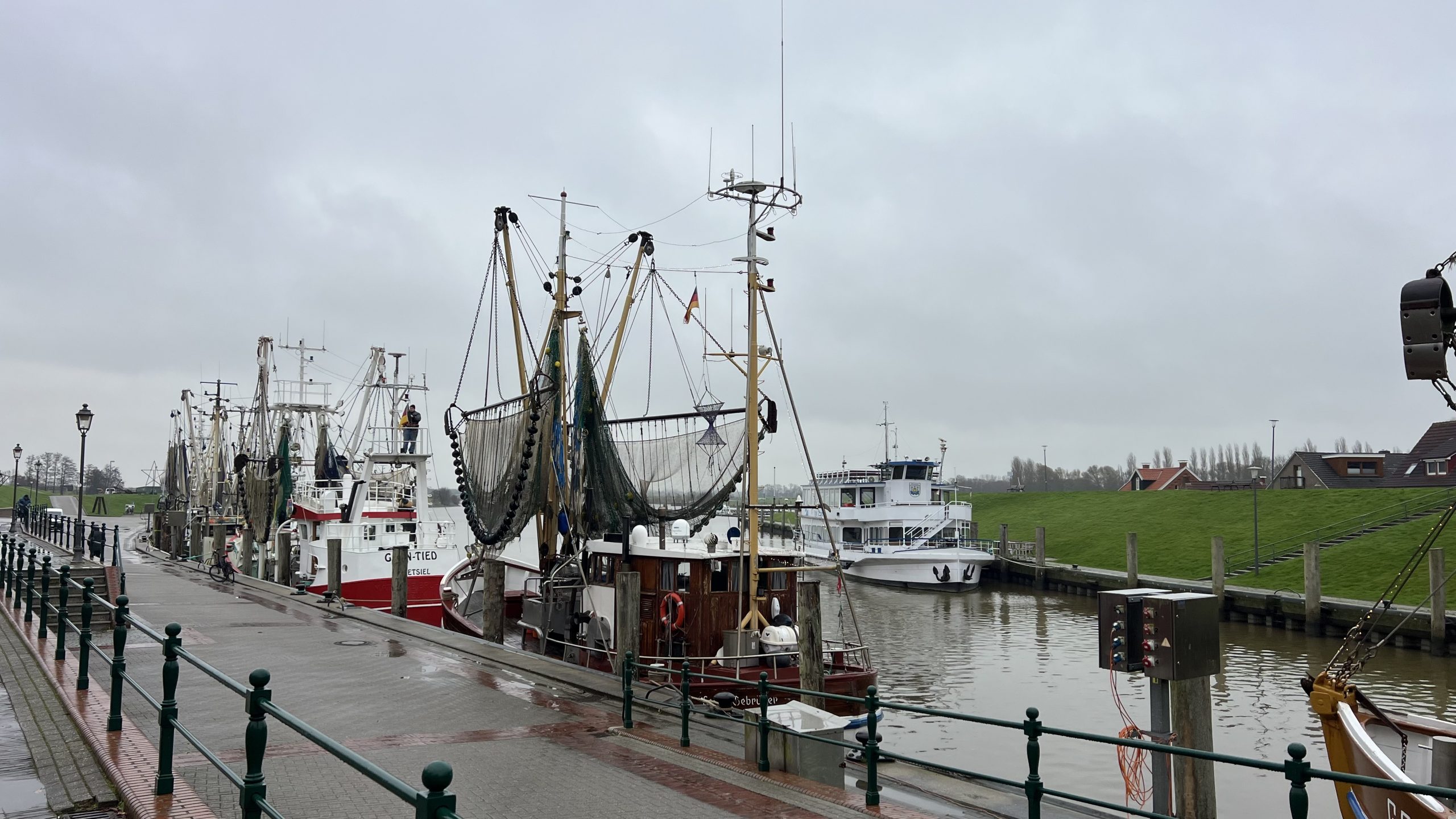 Dann kommen wir zum Hafen. Ein wenig unbeachtet liegt der Hafen heute im Regen und selbst die Krabbenkutter können die Stimmung nicht heben. Das Tüpfelchen auf dem i ist jedoch der „Weihnachtsmarkt“.