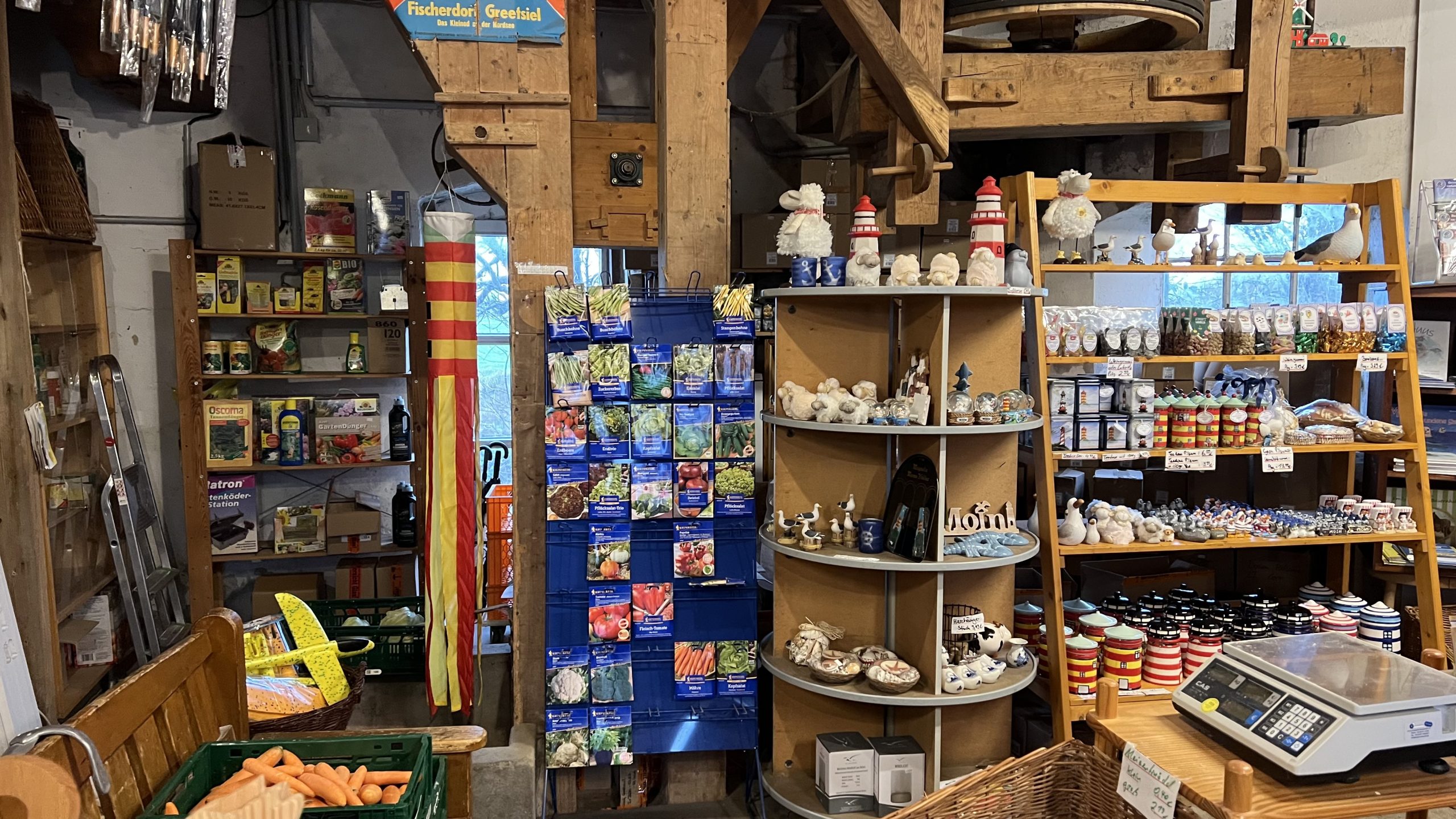 Bei diesem Wetter laufen wir nicht zum Leuchtturm. Ein bisschen haben wir gehofft, das der Regen nachlässt – das macht er aber nicht … so bringen wir diese 4,5 Km nicht hinter uns und drehen um, um zum Greetsieler Weihnachtsmarkt zu gehen. Auf dem Weg zum Hafen sehen wir uns die Angebote des „Strandgut“ an.