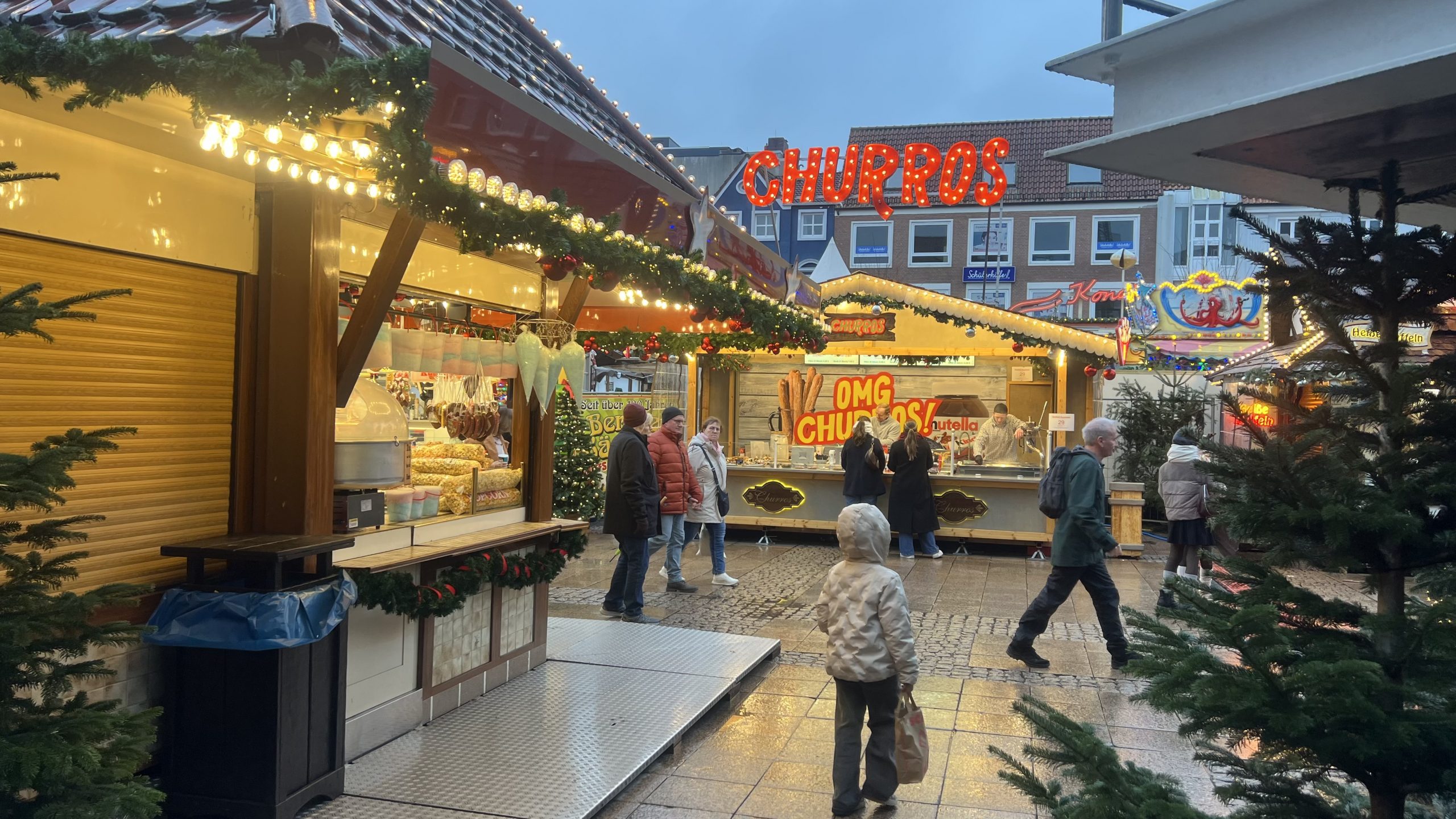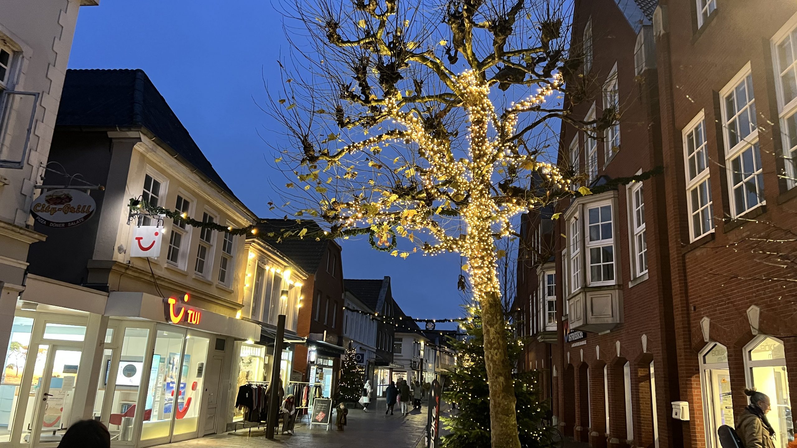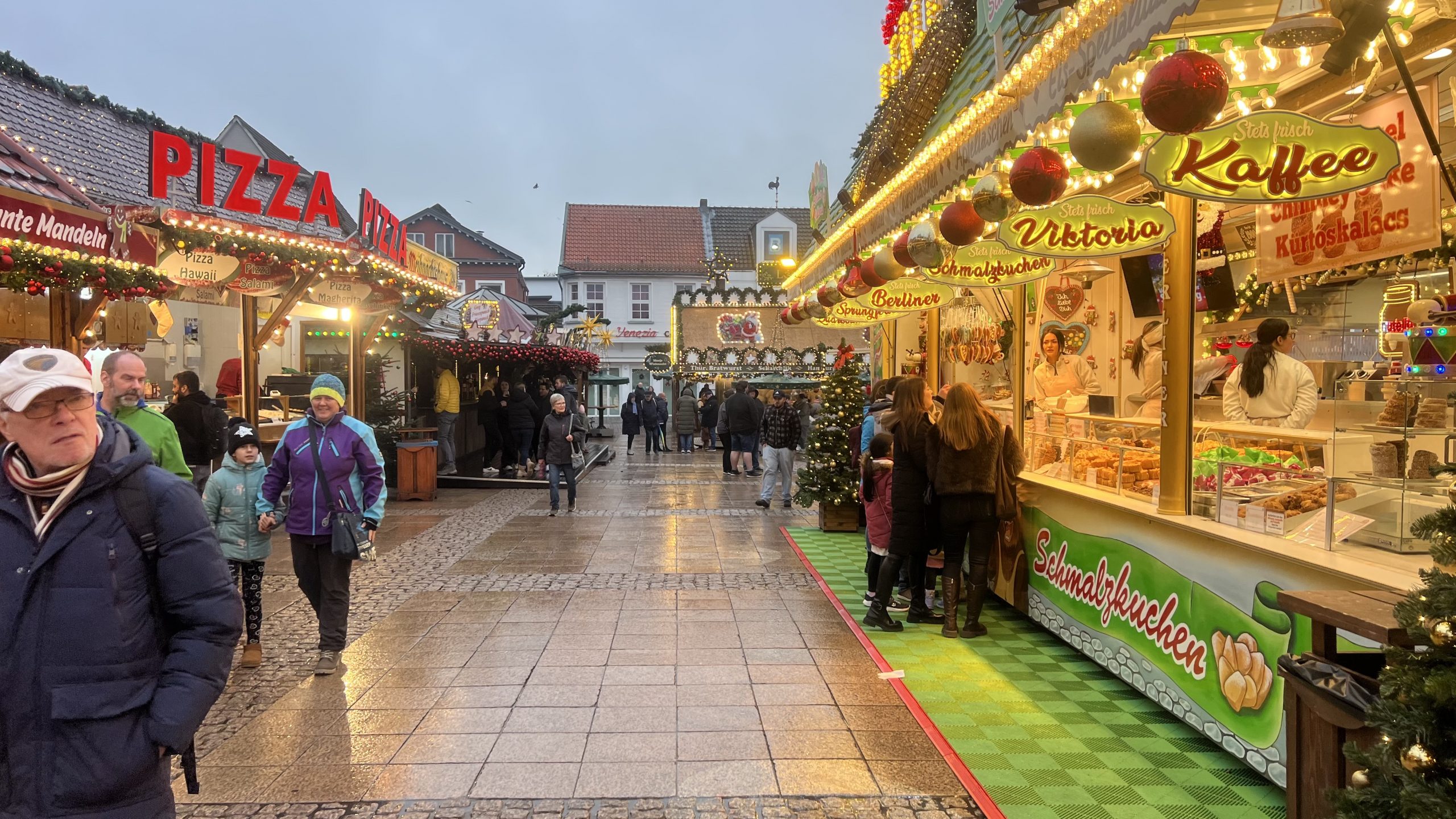 Nun gehen wir ein bisschen durch die Einkaufsstraße, um im Dunklen noch einmal den Weihnachtsmarkt zu besuchen. Zwischenzeitlich gibt es Kaffee und Kuchen beim Wikingerbäcker 👍🏻