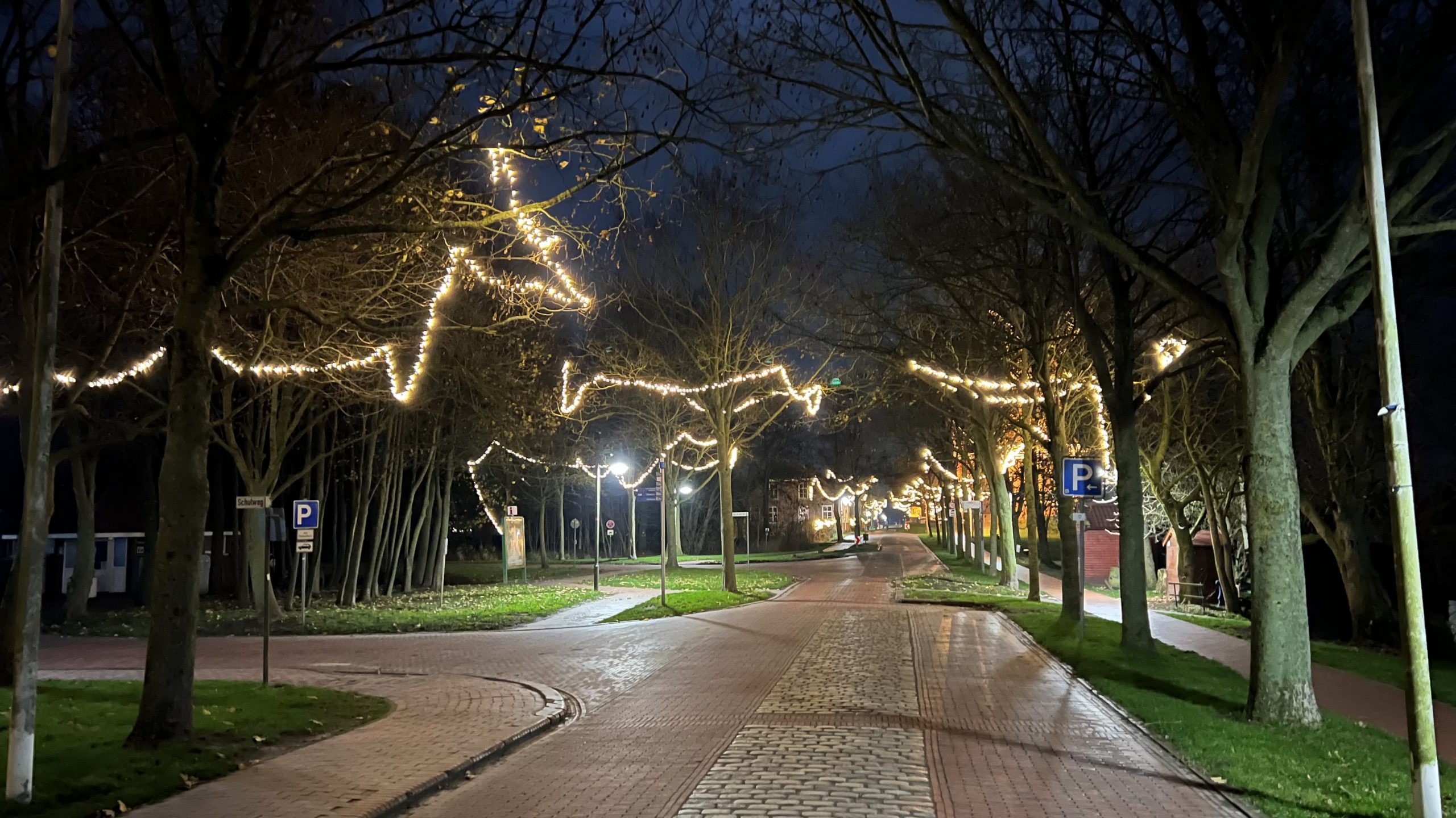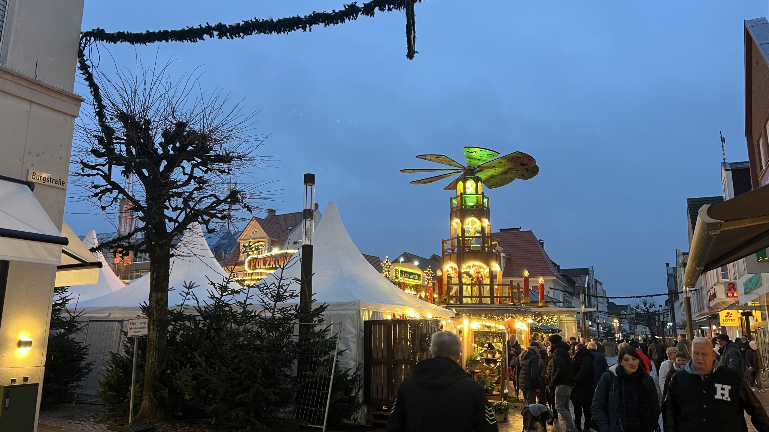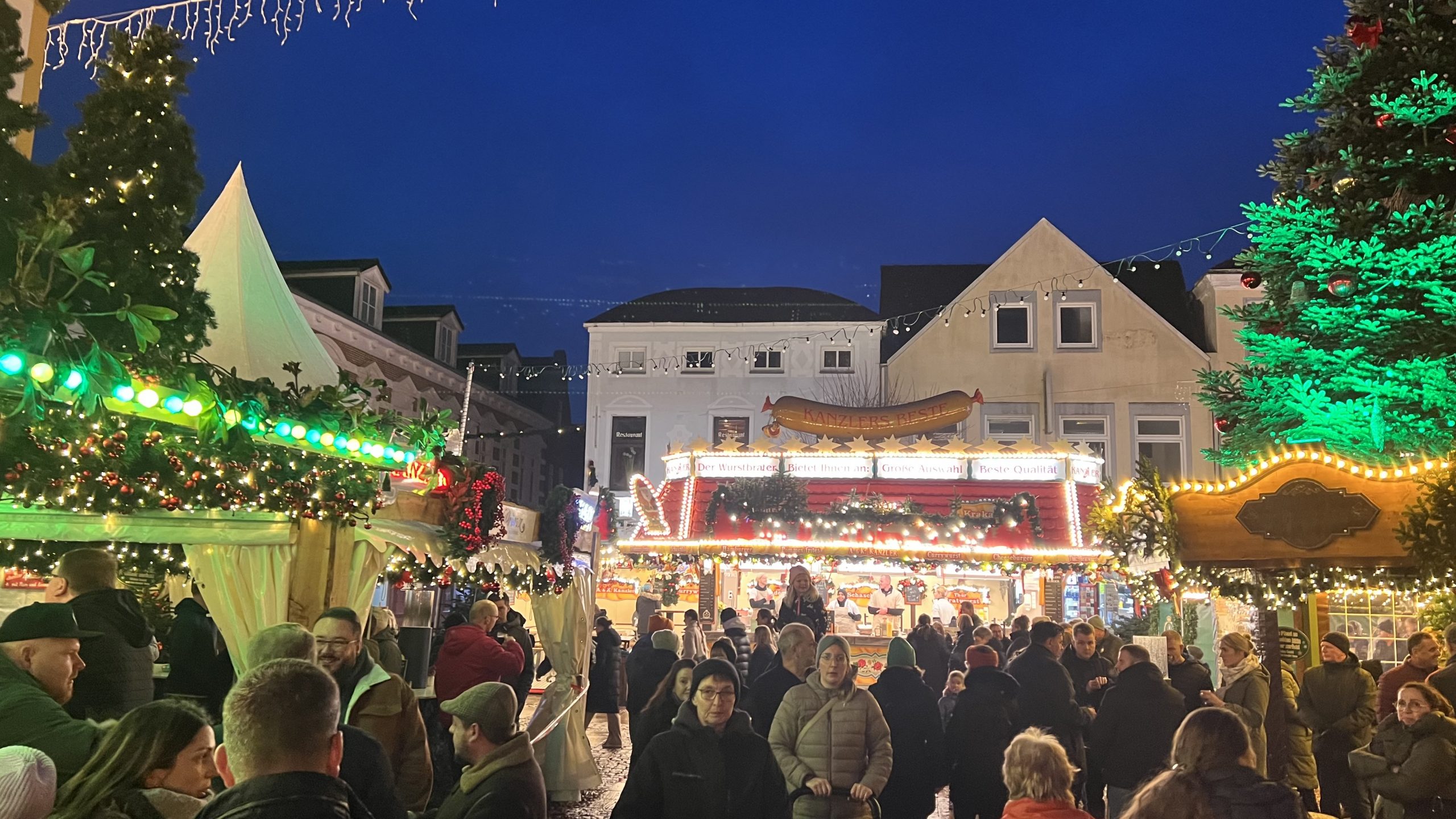 Nun gehen wir ein bisschen durch die Einkaufsstraße, um im Dunklen noch einmal den Weihnachtsmarkt zu besuchen. Zwischenzeitlich gibt es Kaffee und Kuchen beim Wikingerbäcker 👍🏻