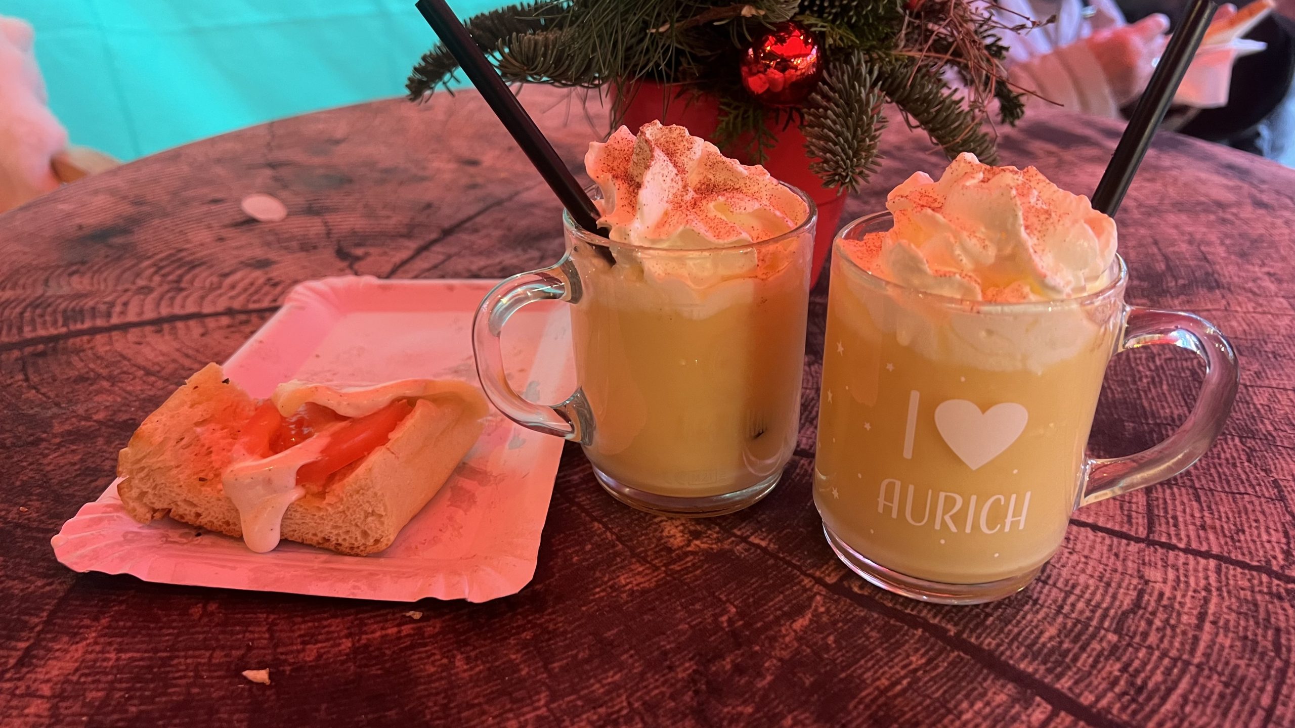 Am Glühweinstand vor den „Gezeiten“ trinken wir einen Glühwein