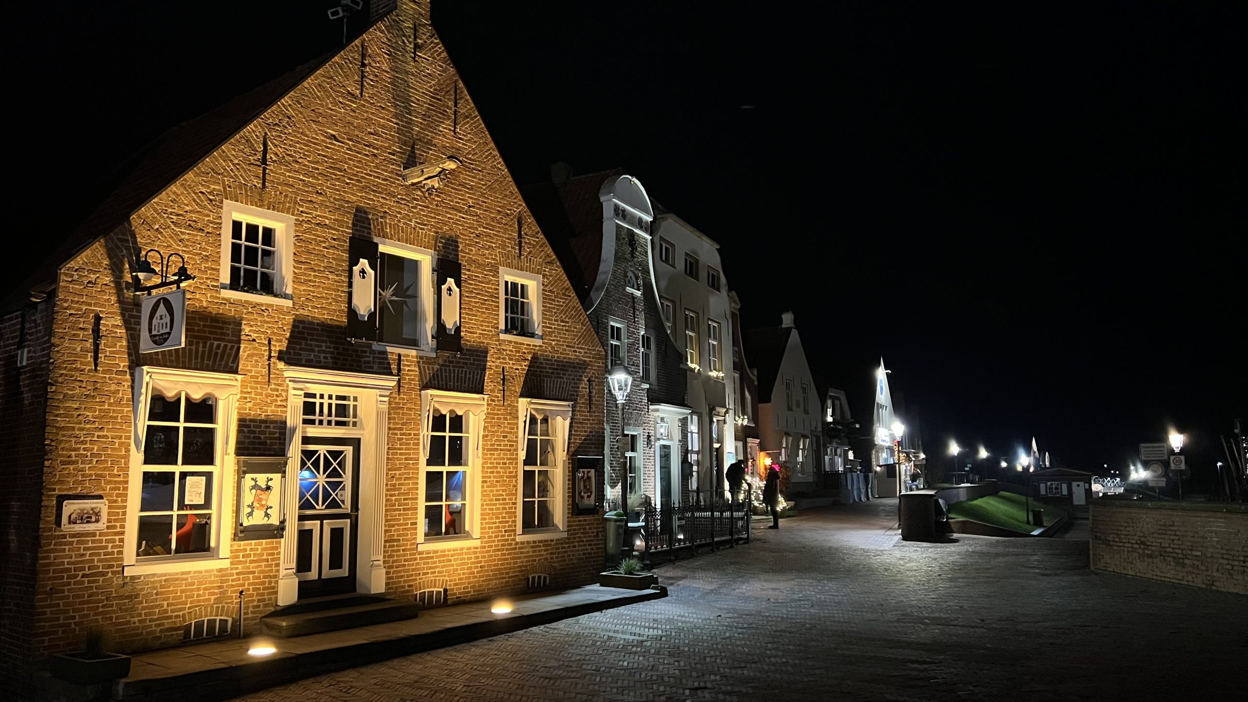 Nach dem Essen machen wir einen Spaziergang durch den Ort, kommen durch die Einkaufsstraße zum Hafen und freuen uns über die beleuchteten Krabbenkutter.