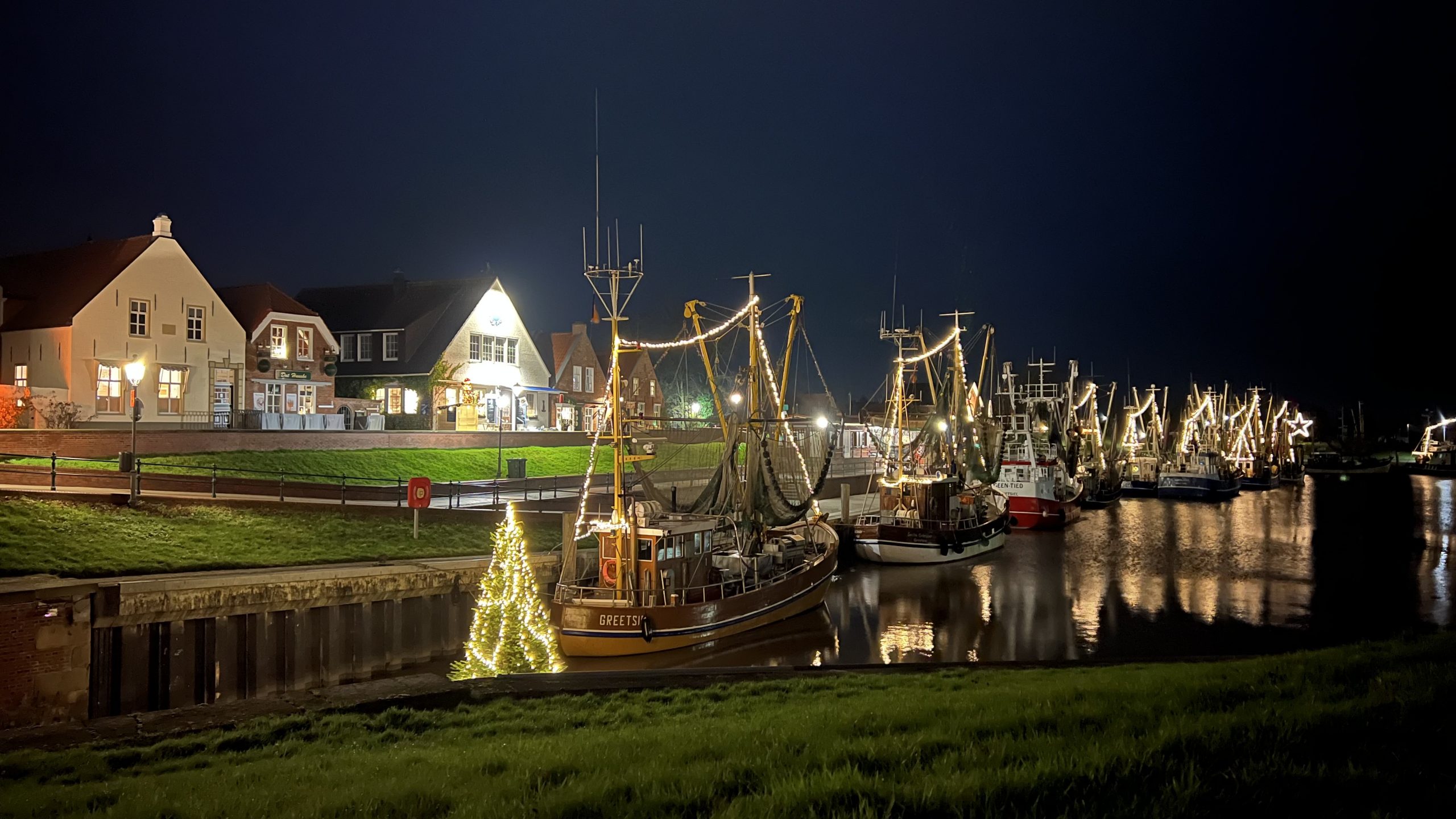 Als wir dann losgehen werfen wir noch einen Blick auf die mit Lichterketten versehenden Krabbenkutter im Hafen.
