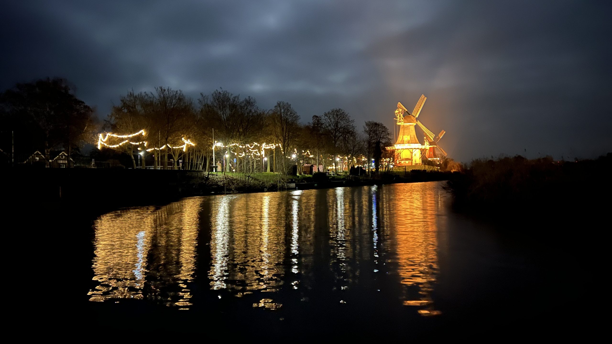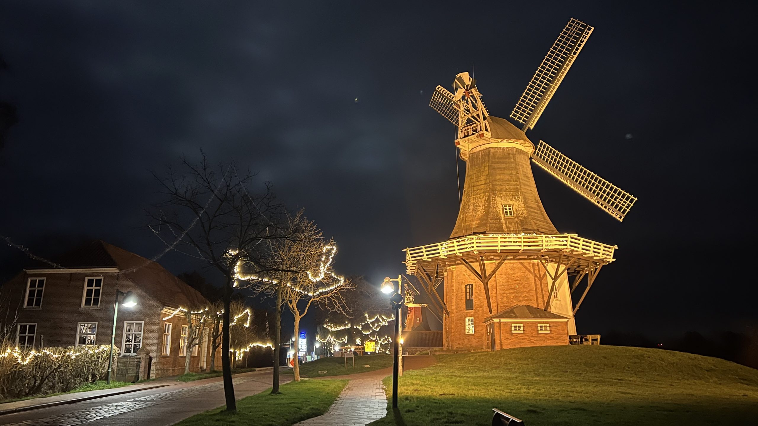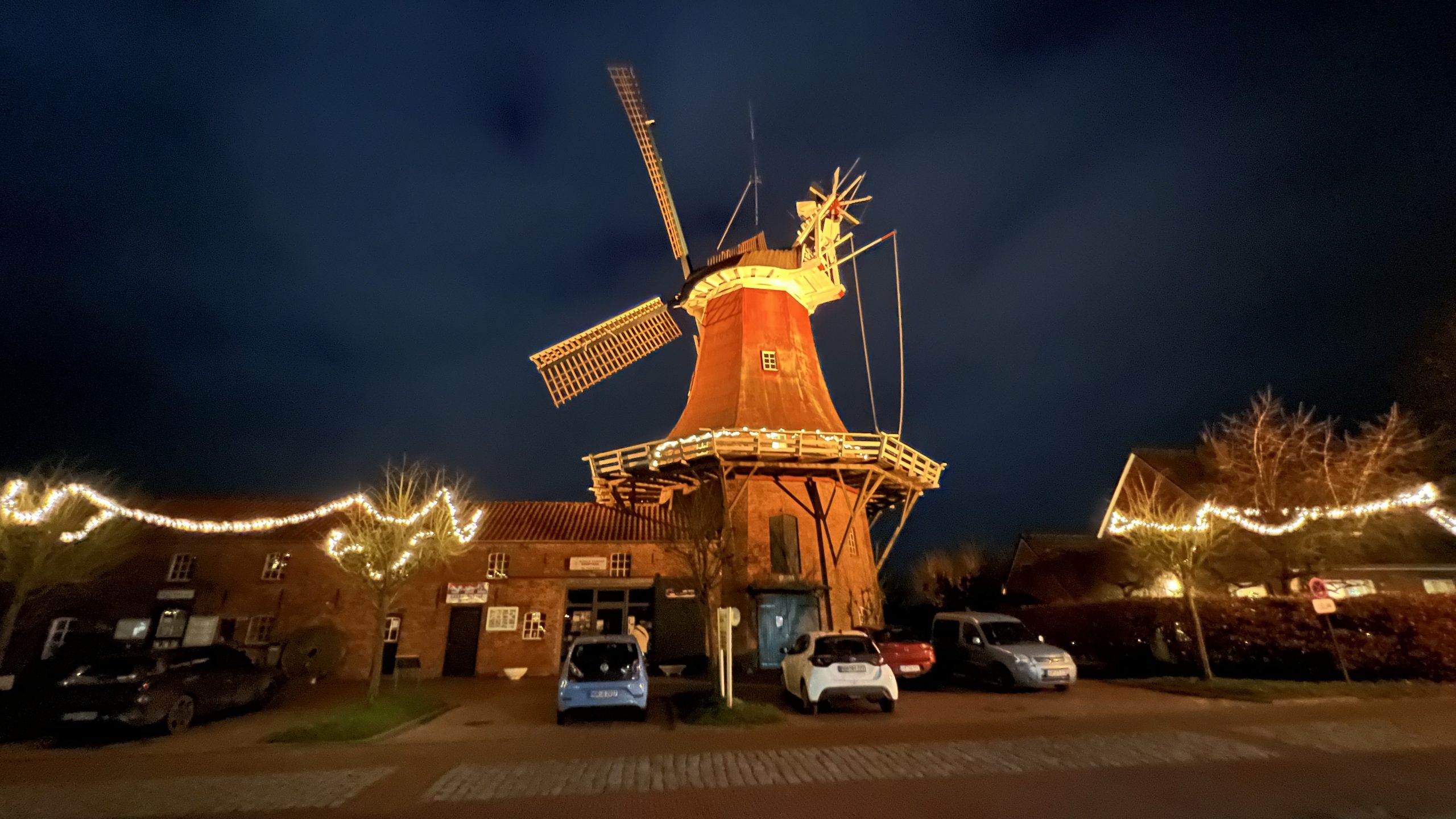 Danach gehen wir noch en bisschen weiter und kommen zu den beleuchteten Mühlen und sehen auch den Wohnmobil-Stellplatz an, bevor wir zum Hotel zurückkehren.