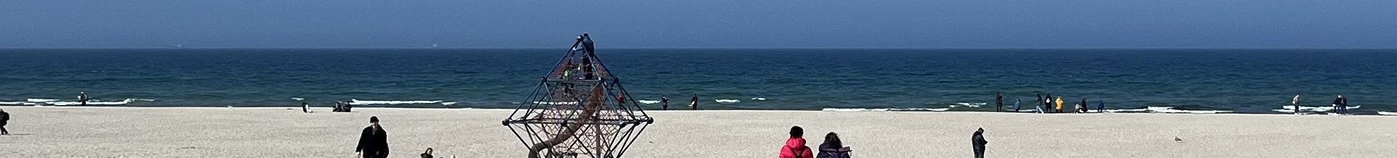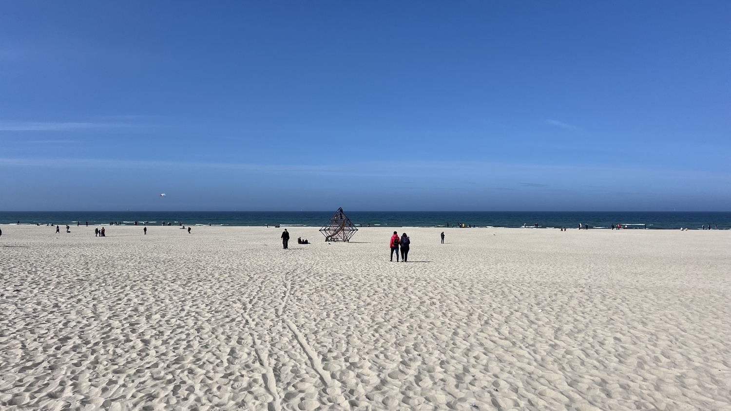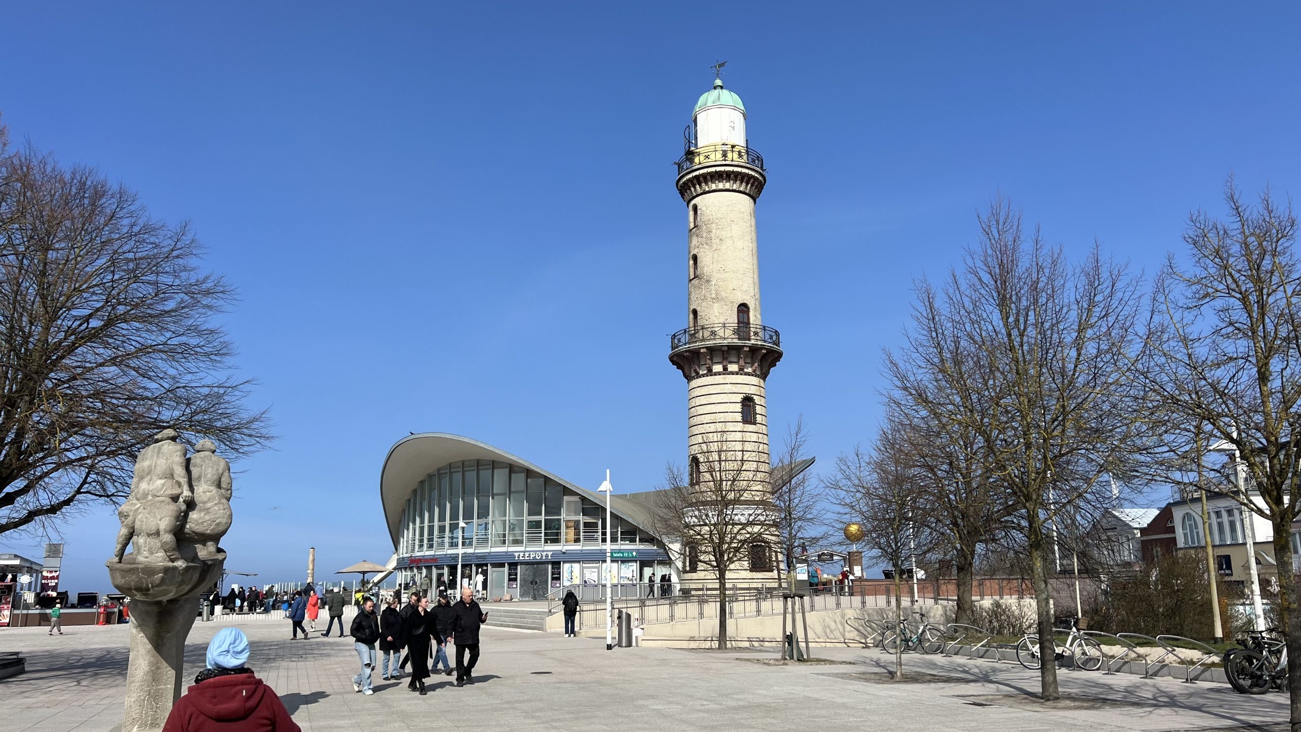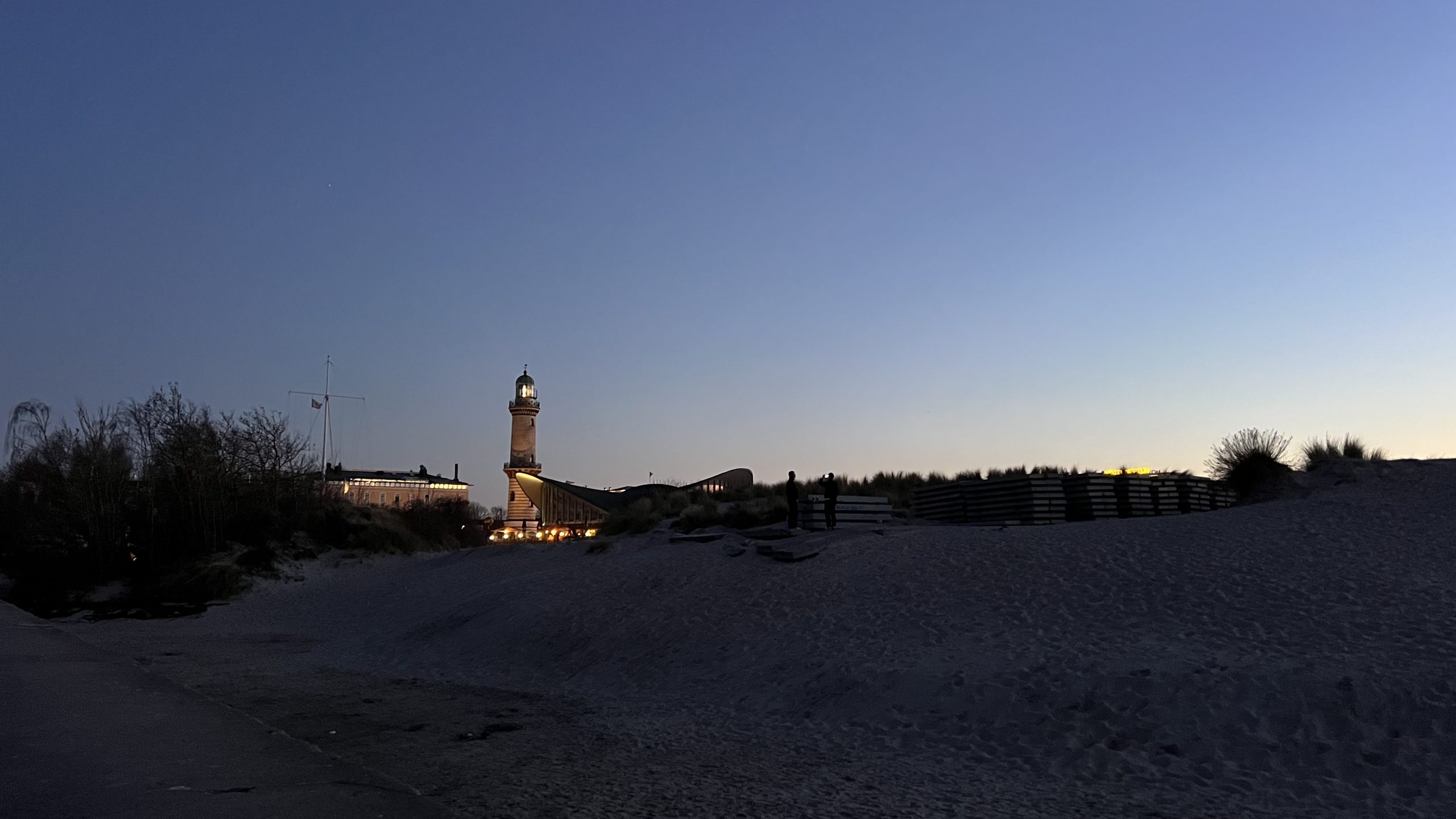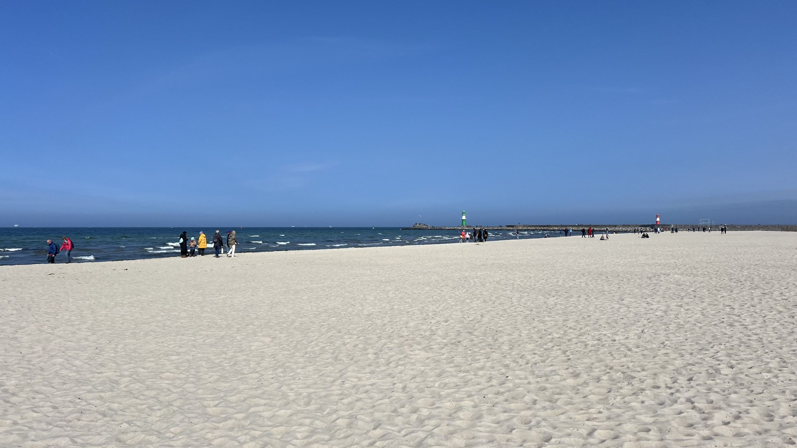 Der Leuchtturm und der Teepott – Wahrzeichen von Warnemünde … Daran gehen wir locker vorbei und kommen bald an den Strand. Es sieht aus, wie im Sommer – nur leerer 😎