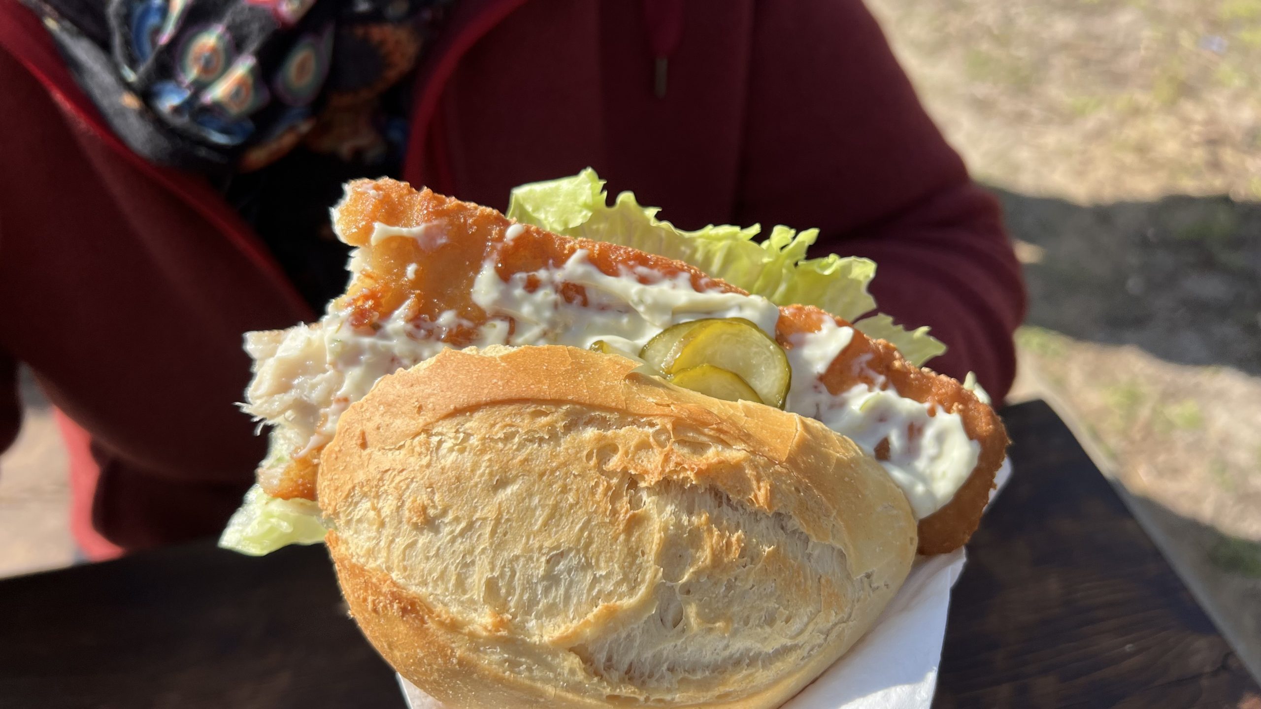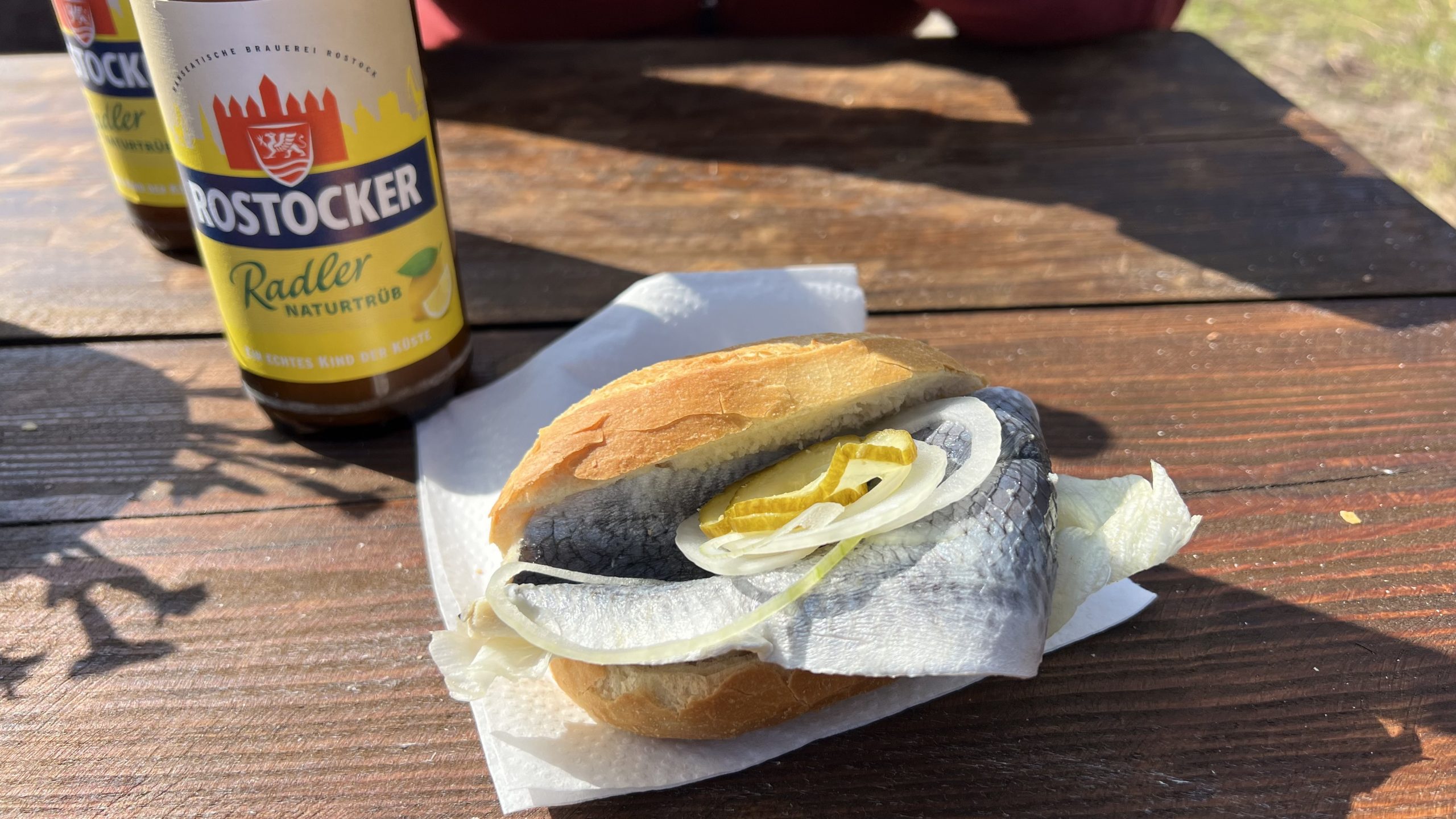 Die gerade gekauften, leckeren Fischbrötchen nehmen wir mit und setzen uns an den Strand. Hier genießen wir unser Mittagessen 😎