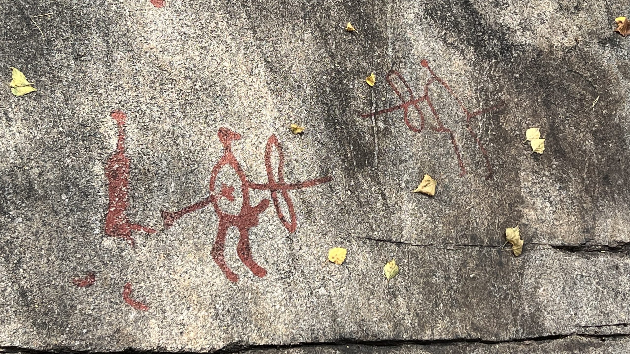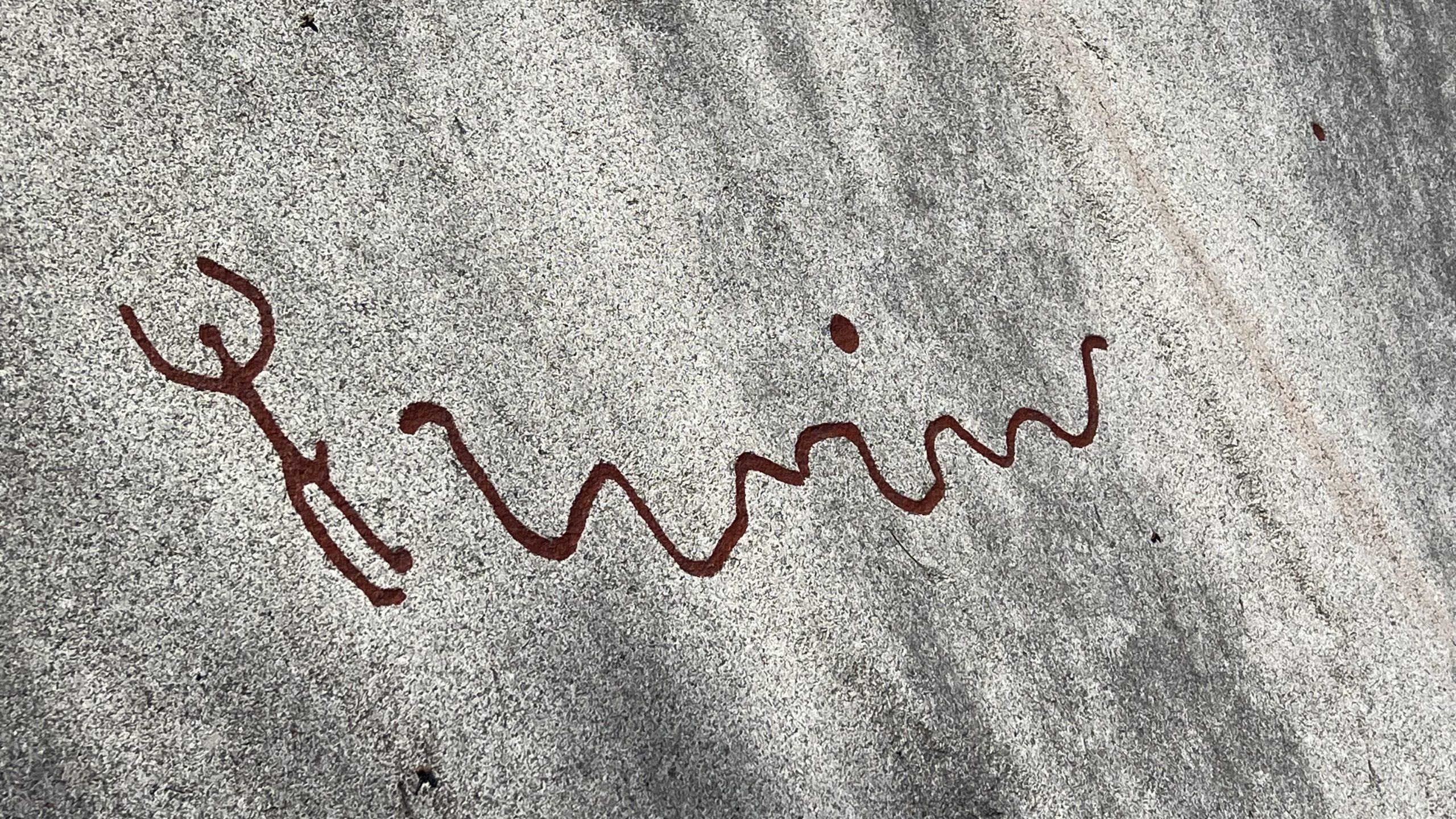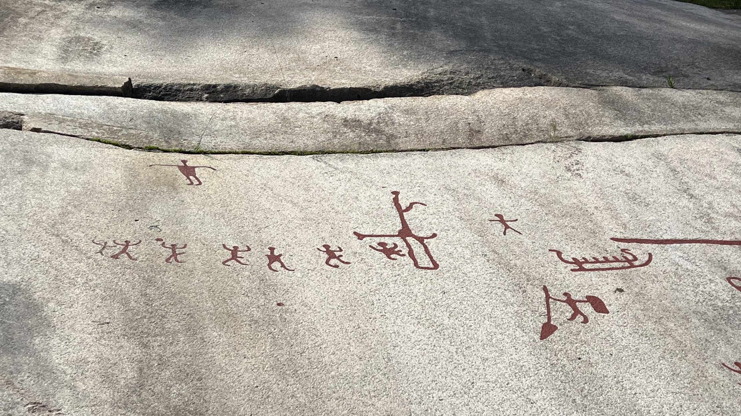 Wir laufen auf einen großen Felsen zu, auf dem man deutlich die Felszeichnungen sehen kann. Sie sind rot gefärbt, doch nur zur Sichtbarkeit … original gab es diese optische Hervorhebung nicht.