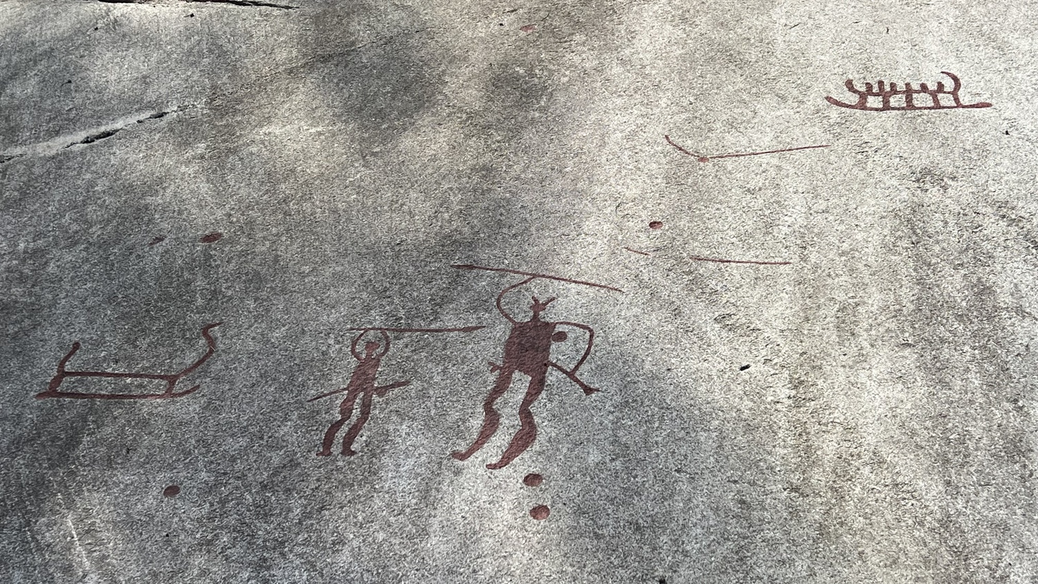 Nach dem Essen laufen wir zu den naheliegenden Felszeichnungen. Es gibt in dieser Gegend mehrere Spots, die recht weit verteilt sind. Im Drohnen-Video morgen kannst du die kurze Entfernung gut sehen.