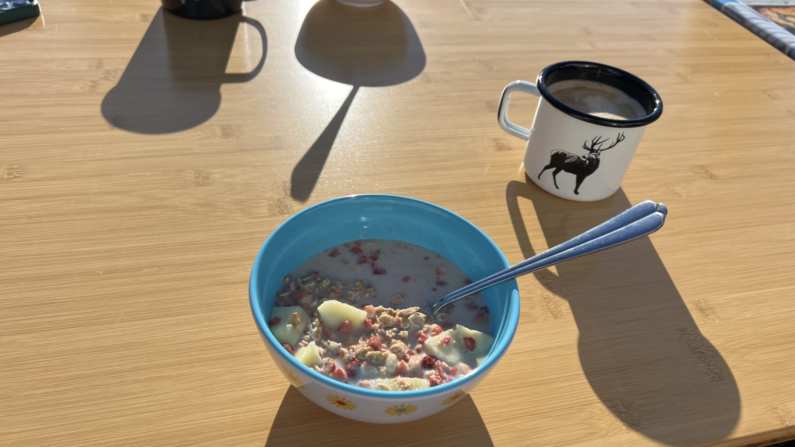 Sonnig beginnt der Tag und es gibt ein leckeres Frühstück.