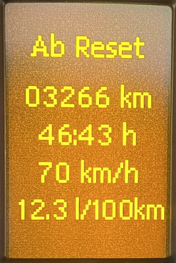 Es sind doch 3266 Km geworden. Die Durchschnittsgeschwindigkeit ergibt sich durch unsere überwiegende Nutzung der Landstraßen.