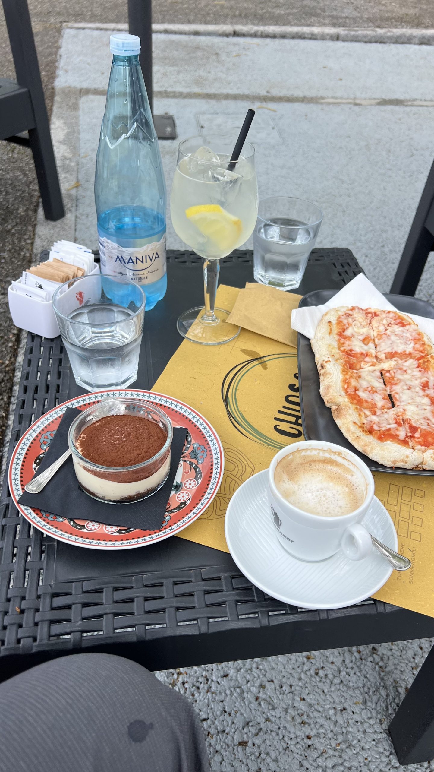 Unser Mittagessen fällt heute plötzlich übergroß aus. Die Pizza wird serviert und plötzlich ist sie größer als die Teller! … dünn ist sie, gut belegt und geschmacklich kann ihr keine andere Pizza der Region das Wasser reichen … Zum Nachtisch wählen wir Tiramisu!